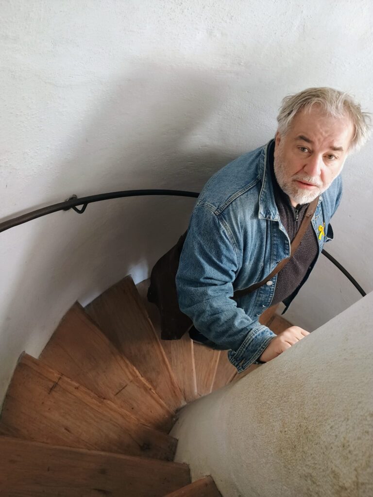 Stále mě něčím fascinuje renesanční ochoz na věži kostela sv. Václava. Až po pár dnech mi to dojde: z různých pohledů – třeba z Lornova náměstí (od galerie Závodný) nebo z cest, které obkružují zámek – vykukuje věžní ochoz ze střech a mezi korunami stromů a vypadá jako podloubí, jako nová ulička, vznášející se a levitující. Města, kterými protéká řeka, se zmnožují odrazem na hladině, zato tady novou ulicí v podnebesí.