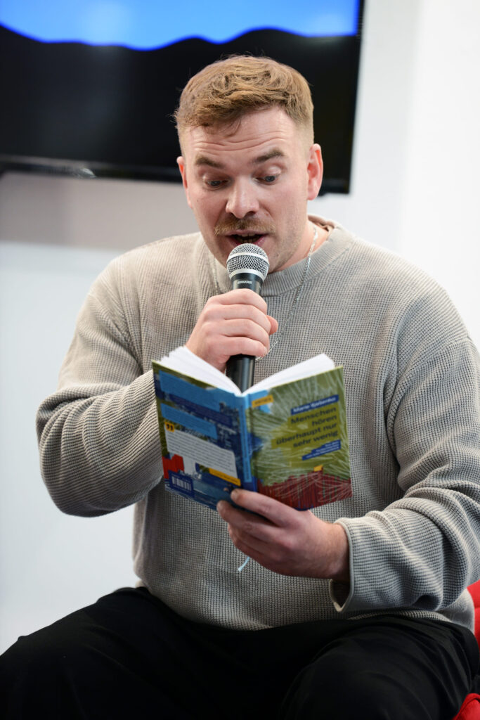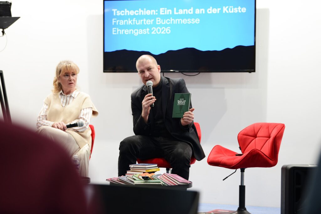 Am tschechischen Nationalstand wurden zwei Bücher vorgestellt: Zunächst präsentierte Petr Hanel seinen Roman „Du weißt nen Scheiß über Sterne“ (Anthea Verlag, übersetzt von Hana Hadas), eine schonungslose Geschichte über das Erwachsenwerden, Männlichkeit und die Suche nach sich selbst im Zeitalter des Internets. Anschließend knüpfte Marie Iljašenko mit ihrem Gedichtband „Menschen hören überhaupt nur sehr wenig“ an (Anthea Verlag, übersetzt vom Julia Miesenböck), der den städtischen Raum einfängt, der sowohl von Menschen als auch von Tieren bewohnt wird. Die Diskussion moderierte Ruben Höppner, die Übersetzung übernahmen Nella Nitrová und Michala Čičváková.